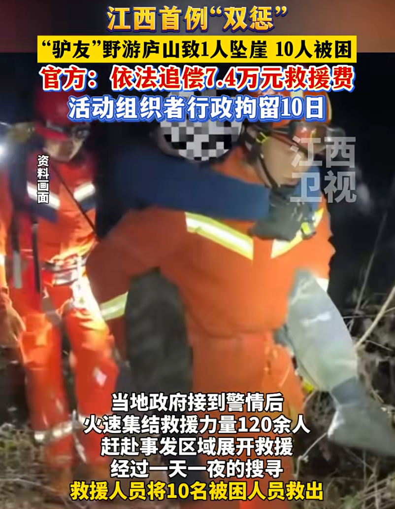 针对庐山“9·27”驴友野游救援事件,当地政府依法依规向被困“驴友”追偿7.4万元救援费用。此前,该野游活动组织者已被行政拘留10日。